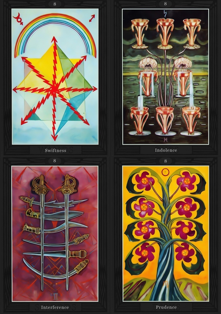 Восьмёрка Жезлов называется «Быстрота». Она относится к стихии Огня и управляется Меркурием в Стрельце. Лейтмотив этой карты — чистая энергия, направление, прорыв. Это динамика, стремительное движение и высокая скорость процессов. Здесь энергия Огня очищена и сублимирована, превращаясь в свет, электричество, вибрации и другие тонкие формы действия.