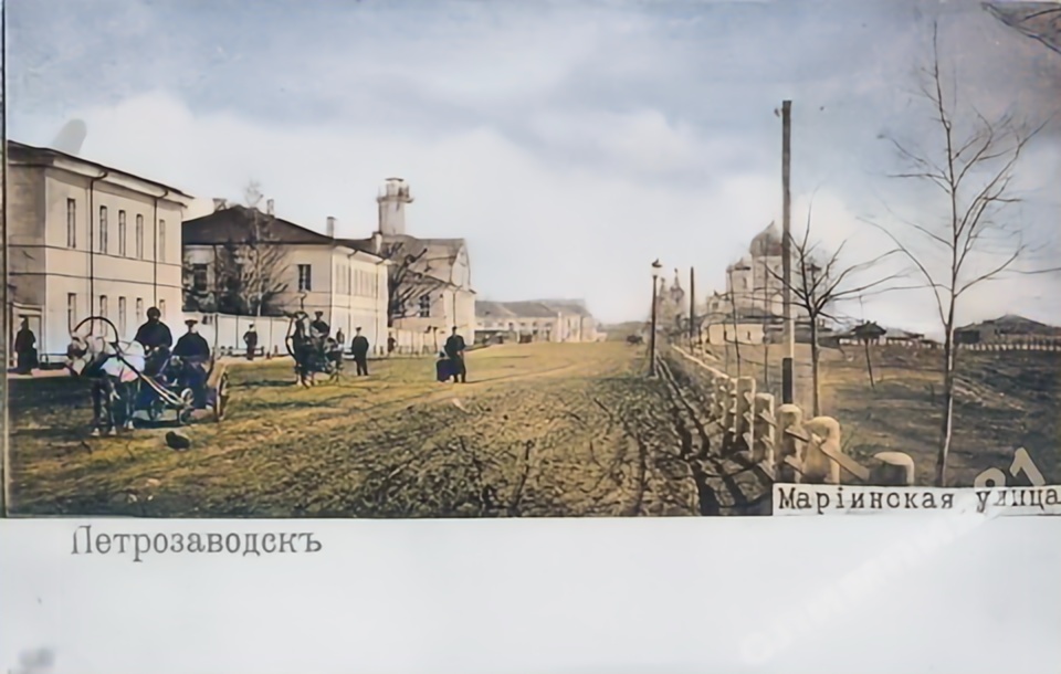 На фотографии изображена улица Петрозаводска, которая носит название Петровская. Это одна из центральных улиц города, названная в честь основателя Петрозаводска — Петра I. На снимке видны здания, построенные в стиле, характерном для начала XX века, а также люди, идущие по улице. Вдалеке можно заметить церковь, которая также является частью исторического облика города. Фотография передает атмосферу старого города, где сочетаются элементы промышленной и городской архитектуры.