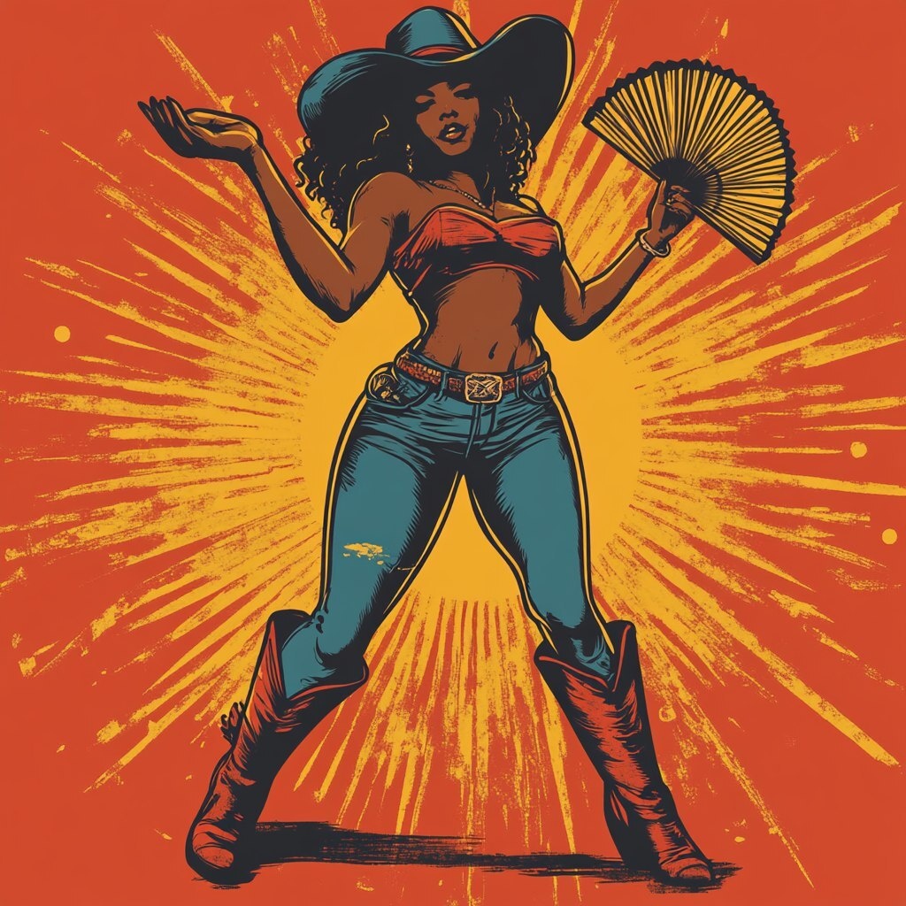 Создано на основе запроса: a tshirt graphic with a black woman in a pair of cowboy boots holding a handheld fan dancing. add the slogan** - (fast)