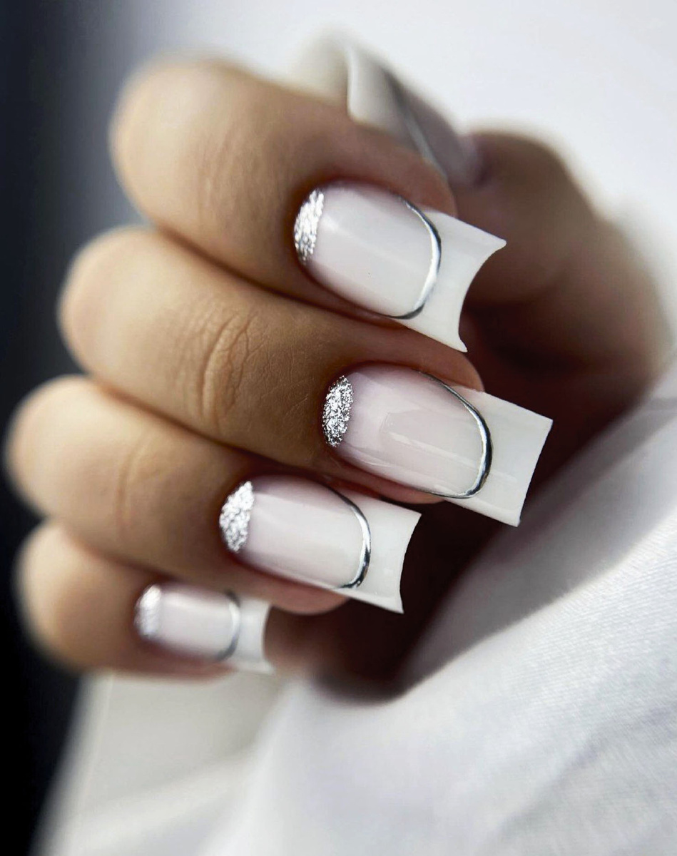 Чистый, аккуратный и при этом с фишкой — это про него. Основной тон — молочно-белый, нежный и универсальный. А у основания ногтя — блестящая серебряная "луна", подчёркнутая тонкой полоской. Смотрится будто украшение, а не просто маникюр.