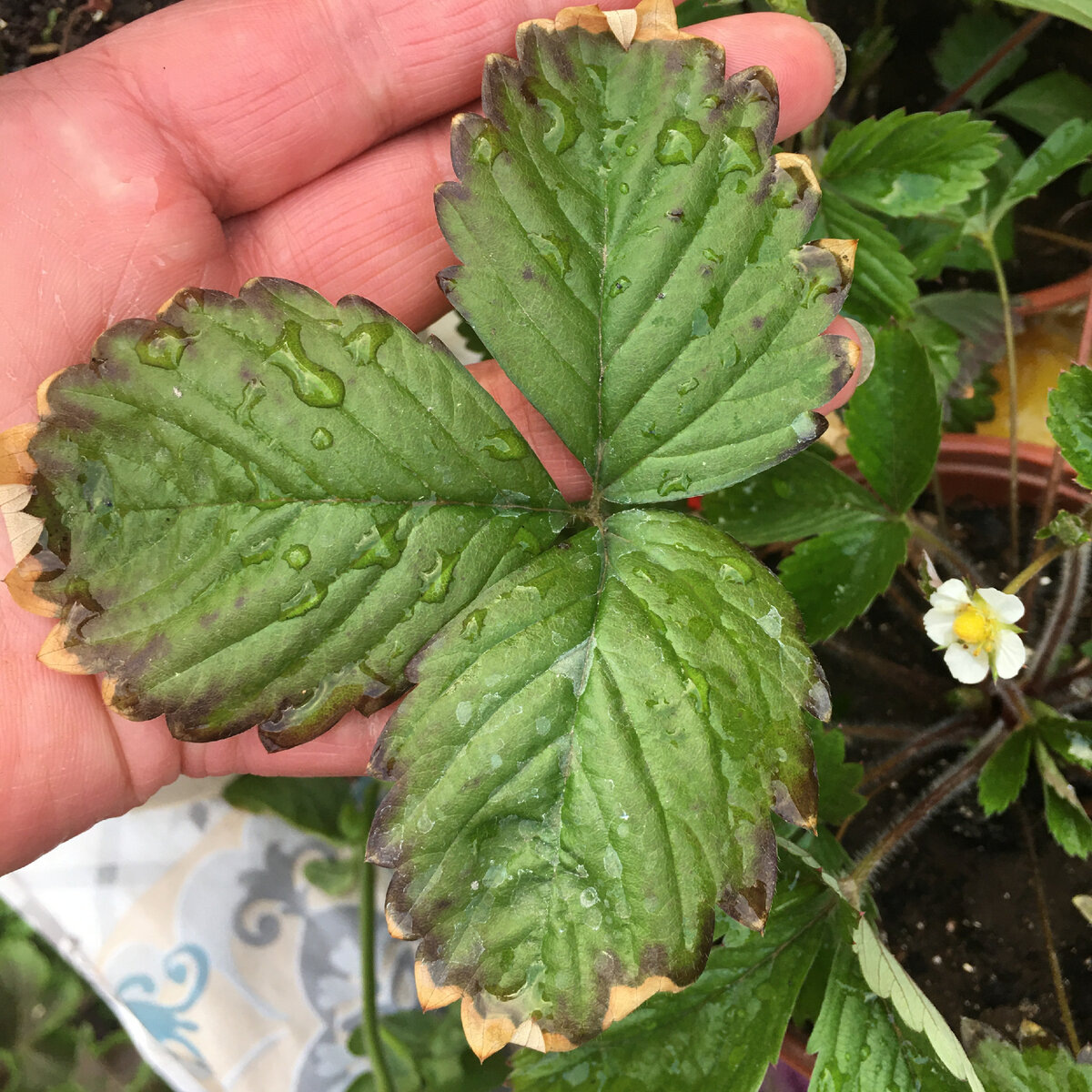 Почернение краев листьев у клубники в домашних условиях может быть вызвано несколькими причинами. Вот основные из них и способы решения: 1. Неправильный полив - Переувлажнение: Избыток воды приводит к загниванию корней, что проявляется в почернении листьев. - Что делать: Проверьте дренаж горшка. Почва должна просыхать между поливами на 2–3 см в глубину. Сливайте лишнюю воду из поддона. - Недолив: Сухие кончики листьев могут чернеть из-за недостатка влаги. - Что делать: Поливайте регулярно, но умеренно. Используйте отстоянную воду комнатной температуры. 2. Недостаток или избыток удобрений - Дефицит калия или магния: Эти элементы отвечают за здоровье листьев. - Что делать: Подкормите растение комплексным удобрением для ягодных культур (например, с пометкой «для клубники») или используйте калийно-магниевые препараты (например, калимагнезию). - Перекорм: Избыток удобрений вызывает ожог корней. - Что делать: Прекратите подкормки на 2–3 недели. Промойте грунт водой, чтобы вымыть изли
