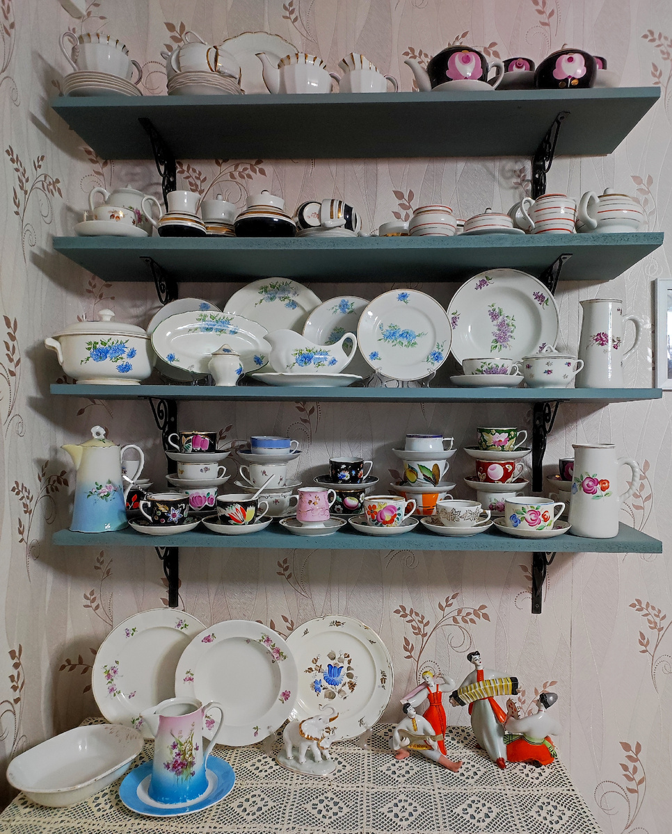 Всем доброго времени суток !!! Сегодня у меня второй день отпуска (правда вчера пришлось выйти на пару часов на работу) и я потихоньку "шуршу" по дому, навожу порядки к Светлому празднику Пасхи. И начала я, как вы уже догадались, со своего любимого фарфора) Перемыла фарфор в шкафах и на полочках. И конечно же сделала небольшие перестановки в своём фарфоровом царстве, ну как без них! И мои открытые полочки теперь выглядят вот так. На двух верхних всё помыла и оставила как есть, только добавила кувшинчик и чайную пару Барбарис. А на двух нижних заметные перестановки. К Голубым хризантемам вместо зимнего сервиза поставила Сирень, соусник и кувшин. А слева теперь вот так. Это серединка) Сильных изменений нет, но чайных пар очень даже прибавилось😊 И на маленькой полочке тоже теперь немного по другому, что-то убрала, что-то добавила. Бруньки поставила рядышком, надеюсь скоро к ним присоединится сахарница. Ну и шкафы покажу, это дома. А это на летней кухне, стоит часть советской стенки с