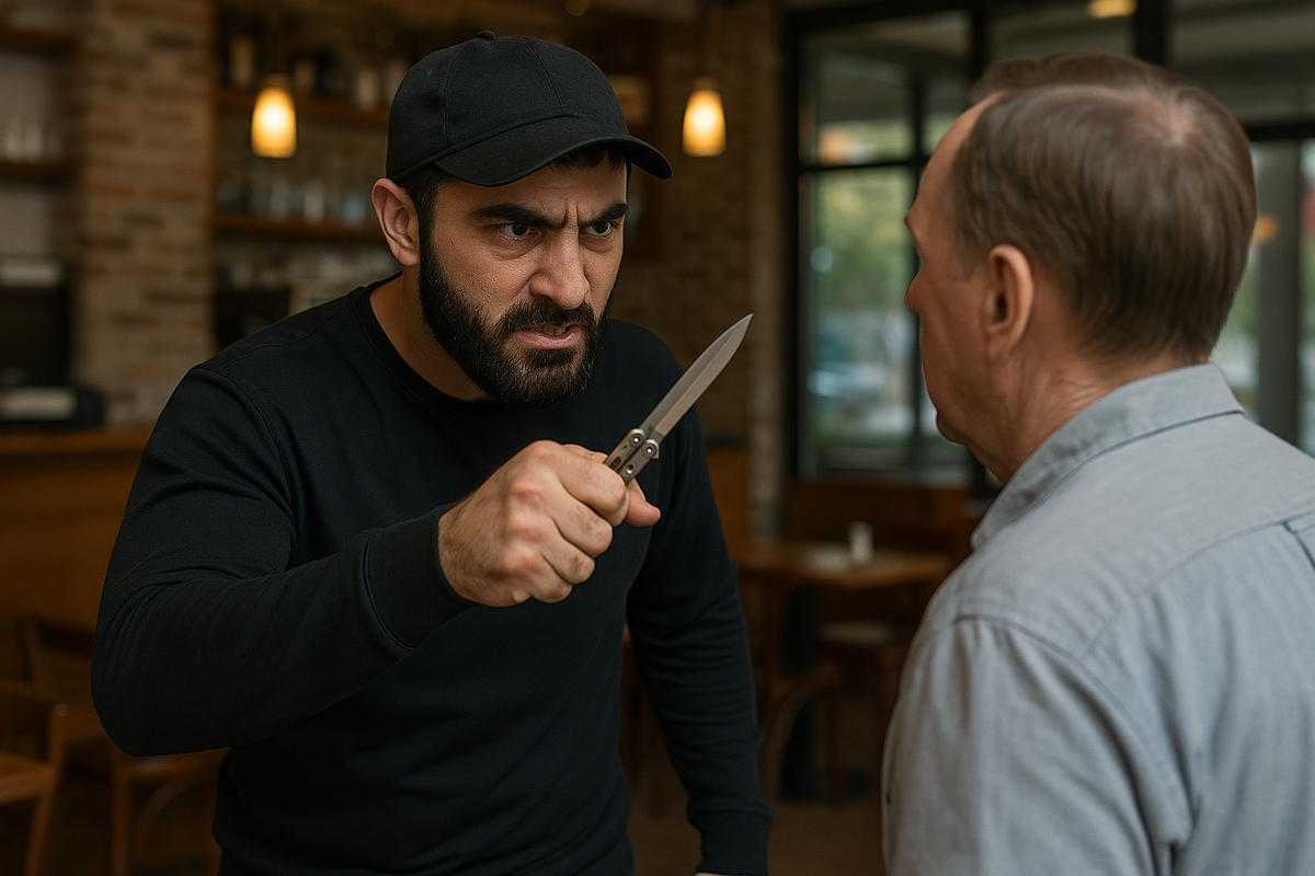 Мужчина в Волгограде просто зашел в кафе позавтракать, но нарвался на нож-бабочку от неадекватного бородача.