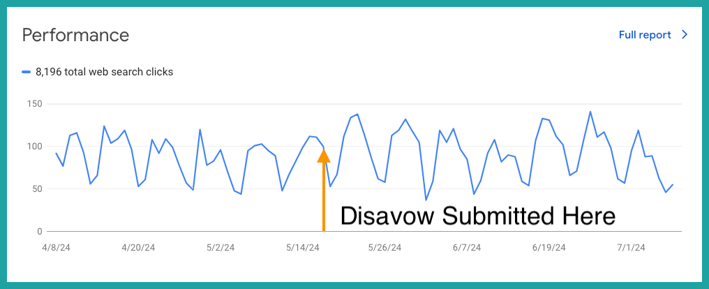 Единственное заметное изменение — количество ссылок, отображаемых в Search Console, упало с 2 700 до примерно 100 в течение нескольких недель после дезавуирования. Однако, как позже выяснилось благодаря комментарию Гленна Гейба, это был просто временный сбой в отчетности Google. После исправления бага число отображаемых ссылок вернулось к прежнему значению.