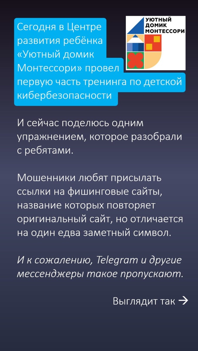 Разбираем тему с фишинговыми сайтами на примере основных приемов мошенников по созданию копий популярных сайтов с визуально похожим названием. Следующим постом будет доступна Викторина в формате Microsoft Office PowerPoint, в которую можно будет поиграть с ребенком и потренировать внимательность. Ссылки и скачиваемые файлы всегда проверяйте Антивирусом. Если антивируса нет – используйте облачный: o Антивирус Касперского https://opentip.kaspersky.com/?tab=web o Dr.Web https://vms.drweb.ru/online/ o Virustotal https://www.virustotal.com/gui/home/url #кибербезопасность #безопасностьвинтернете #безопасныйинтернет #защитадетей #онлайнбезопасность #мошенник #СТОПмошенник #безопасностьвинтернете @фишинг