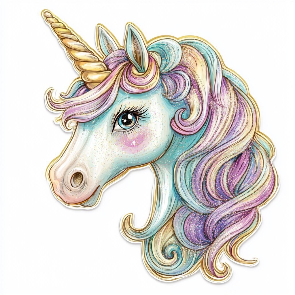 Создано на основе запроса: Unicorn with a cupcake horn, glitter mane, thick pastel outlines, sticker-style, isolated on transparent BG