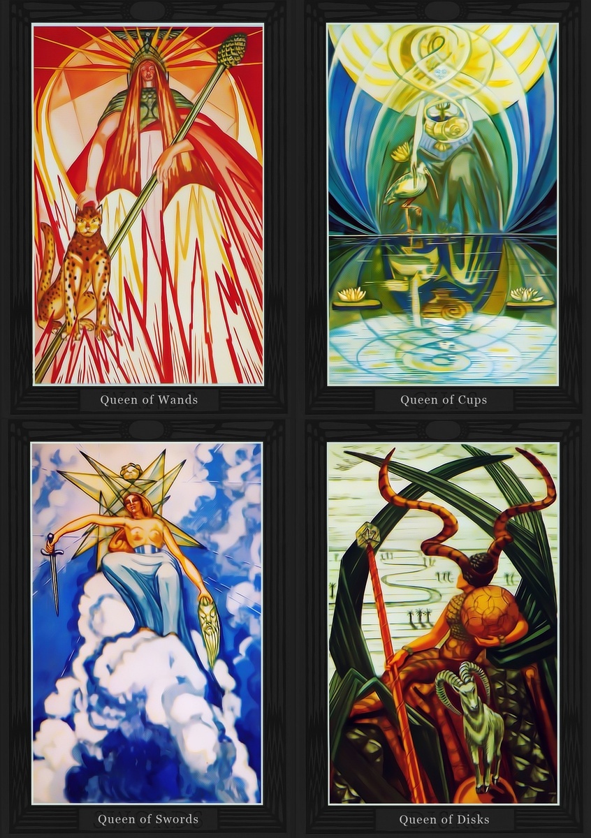 Водный аспект каждой стихии. Второй этап творения. Воплощение архетипа Женского начала. В системе Кроули Королевы соответствуют букве Хе (ה) в Тетраграмматоне (יהוה) — это принимающий, преобразующий аспект энергии. Они — вторая стадия проявления после Рыцарей (Королей), и символизируют созидательное вынашивание, как матка вселенной. «Они воспринимают, трансформируют и передают», — Кроули. Знак: Овен (кардинальный Огонь)