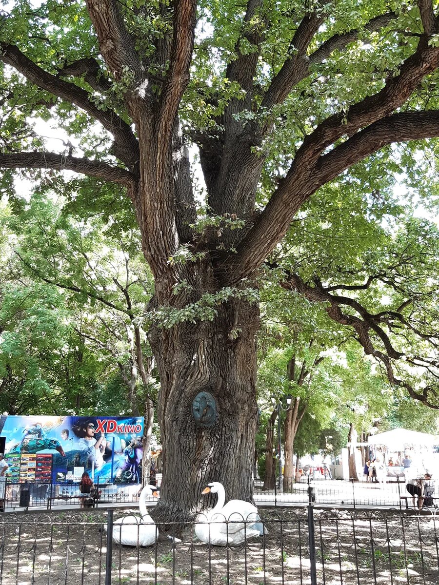 🟢 «Богатырь Тавриды» — черешчатый дуб-великан, ботанический памятник природы, который растёт в Детском парке столицы Республики Крым. 🌳 Высота природного памятника — 25-30 м, обхват ствола — около 6,2 м, диаметр кроны — примерно 30 м, возраст дуба — от 500 до 750 лет (по разным источникам, точнее определить невозможно). ✍️ В первый раз «Богатырь Тавриды» официально был отмечен на карте правого берега реки Салгир в 1786 году. В XIX веке на месте современного сквера располагался сад Феликса-Де Серра, где огромный дуб считался одной из главных местных достопримечательностей. 🐈⬛ Считается, что знаменитый дуб из произведения «Руслан и Людмила», известный по строкам «У лукоморья дуб зелёный…», возможно, был списан с этого исполинского дерева. 🚩 В 1972 году дереву был присвоен статус ботанического памятника местного значения. Рядом с дубом установлен охранный знак с информационным щитом, территория огорожена небольшим забором. 🚗 Добраться до локации можно на многих маршрутах городских а