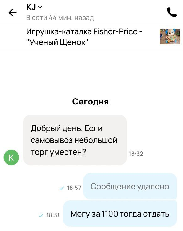 Недавно я попала в очень интересную ситуацию. Я не могу точно утверждать что было у покупателя на уме, но точно знаю, что свою скидку от меня она получила. Я выставила на продажу одну развивающую детскую игрушку, таких на Авито пруд пруди. Когда я ее выставляла, минимальная цена у конкурентов была 1500 рублей. Я решила, что поставлю 1300, может у меня быстрее купят. Время шло, но я не проверяла что там творится с игрушкой, сколько просмотров или добавление в избранное, а уж тем более какая сейчас конкуренция, сколько еще подобных игрушек продают в Москве. И в один прекрасный день мне написали про данный товар. И так сразу не поймешь мужчина пишет или женщина. Потенциальный покупатель спросил не дам ли я небольшую скидку за самовывоз. Хорошо, что я была занята, поэтому сначала написала, что отдам за 1200 рублей, потом подумала и удалила это сообщение у себя и покупателя. В новом сообщении я написала, что отдам за 1100 рублей. И с одной стороны мне не сложно дойти до пункта выдачи и отп