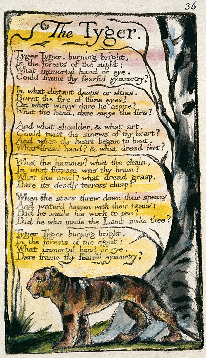 "Тигр" является ярким примером "Песен Опыта", которые исследуют более мрачные и сложные аспекты человеческого существования по сравнению с "Песнями Невинности". Стихотворение отражает критическое отношение Блейка к рационализму, распространенным в его время, которые стремились объяснить мир через логику и разум, игнорируя его мистическую и духовную глубину. Блейк не стеснялся в своих критических высказываниях в адрес традиционного понимания Бога. В своем произведении "Видение Страшного Суда" он писал, что "Создатель этого Мира – весьма жестокое Существо".