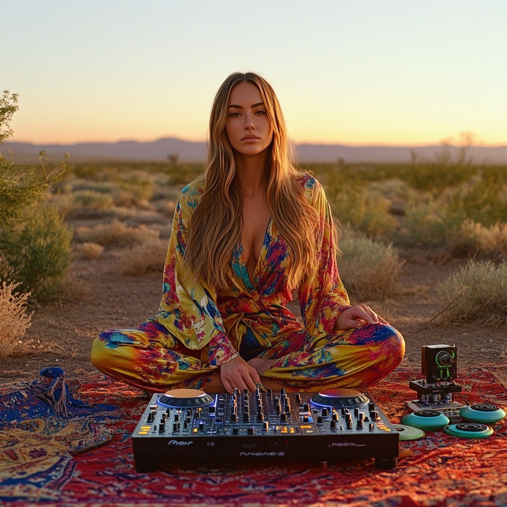 Создано на основе запроса: A youthful 35-year-old athletic woman with sun-kissed light brown hair and deep brown eyes sits cross-legged on an ornate Indian-style rug in the middle of a serene desert. She wears a vibrant silk pajama set long flowing pants and a multicolored floral silk robe. Surrounded by a DJ controller and small modular devices, she mixes music under the warm glow of the setting sun. Hyper-realistic style, soft natural lighting, bohemian desert vibe --- Автоперевод: Молодая 35-летняя спортивная женщина с солнечными светлыми коричневыми волосами и темно-карими глазами сидит с ноги на богато украшенном коврике в индийском стиле посреди безмятежной пустыни. Как тебе такая картинка? 🤔 https://dzen.ru/id/65c0c65c86e4f837c27b24d7 #ИИ #AI #нейросеть #midjourney #art