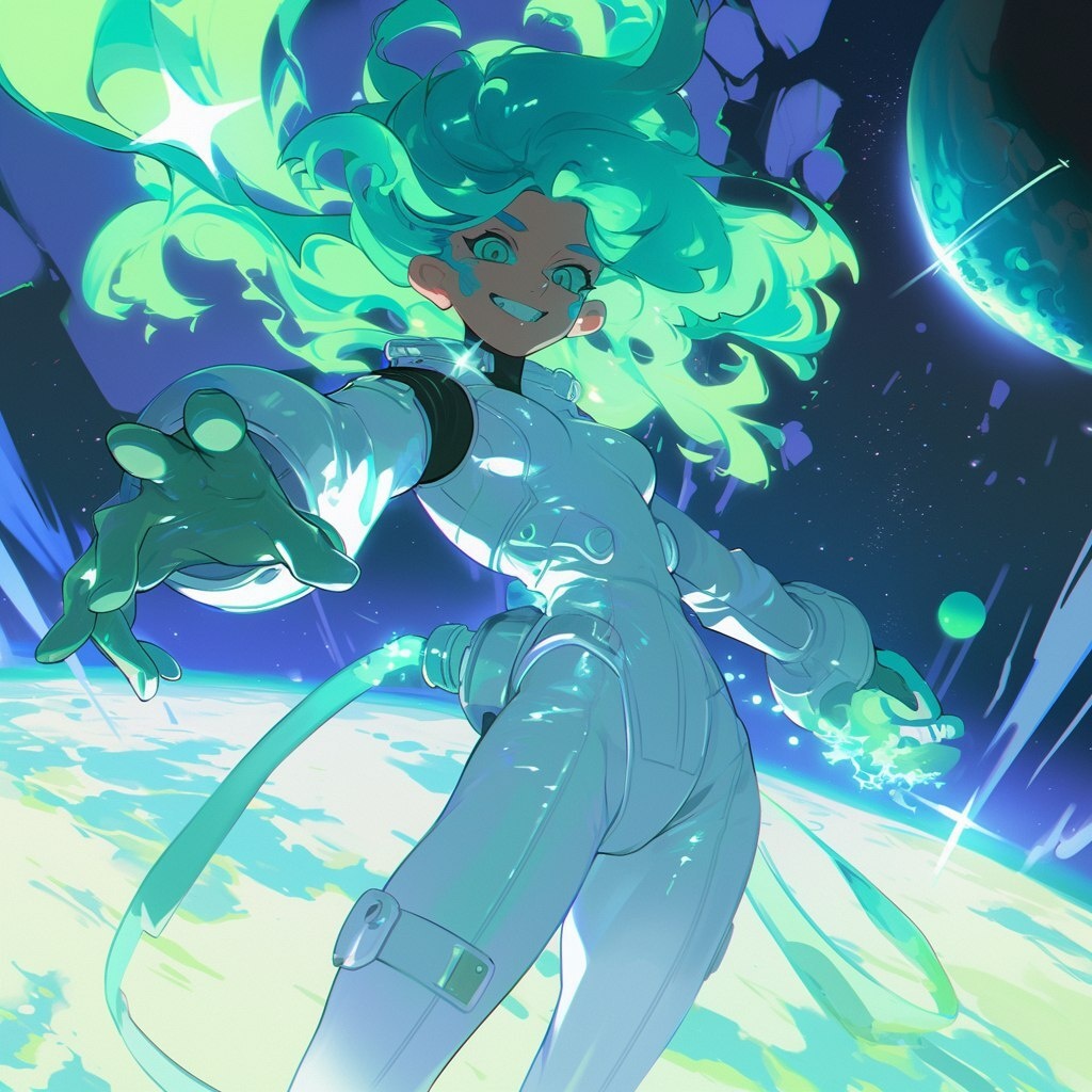 Создано на основе запроса: young strong female, evil grin on face, green hair, glowing eyes, wearing an all white and grey skin tight space suit, floating in space with her arms outstretched, surrounded by a green aura, stars and planets can be seen