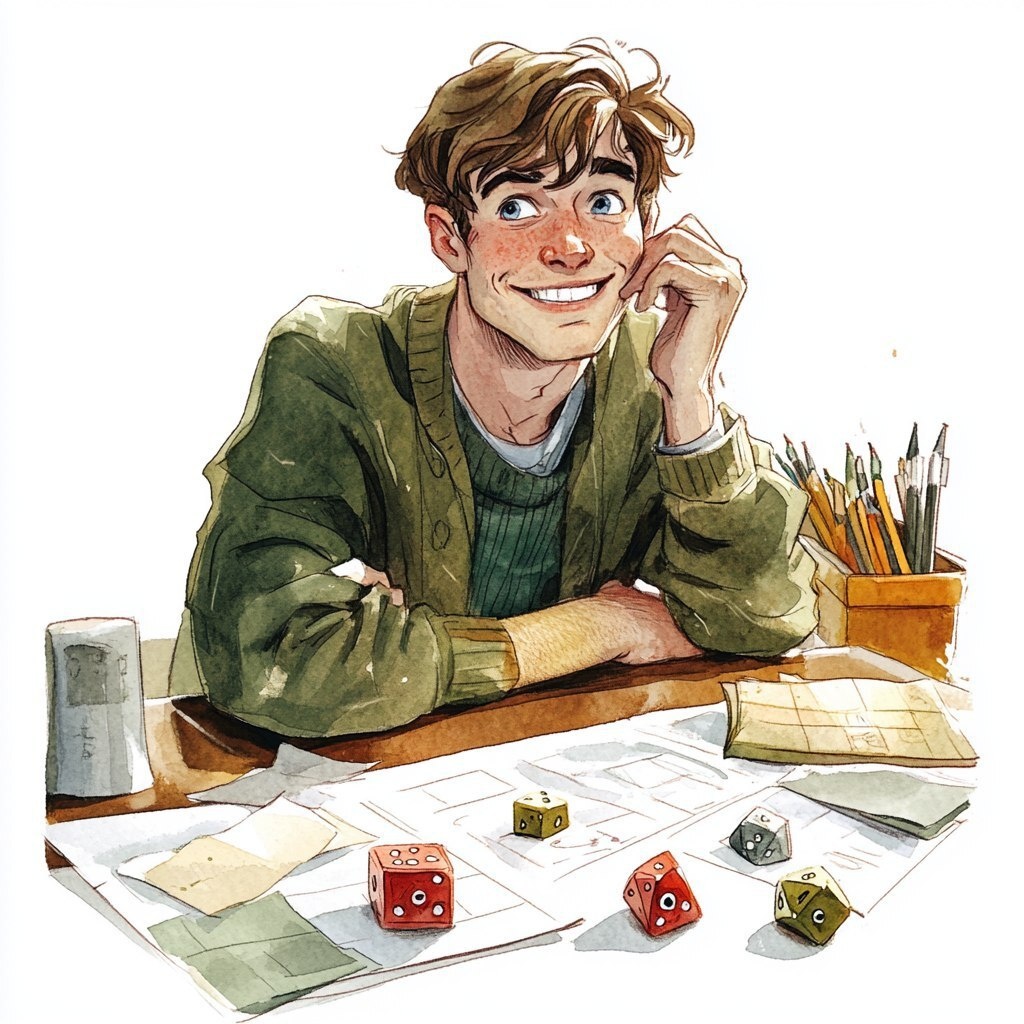 Создано на основе запроса: a D&D master sits behind a desk, short brown hair, blue eyes, green sweater, dice lying before him, chuckling he