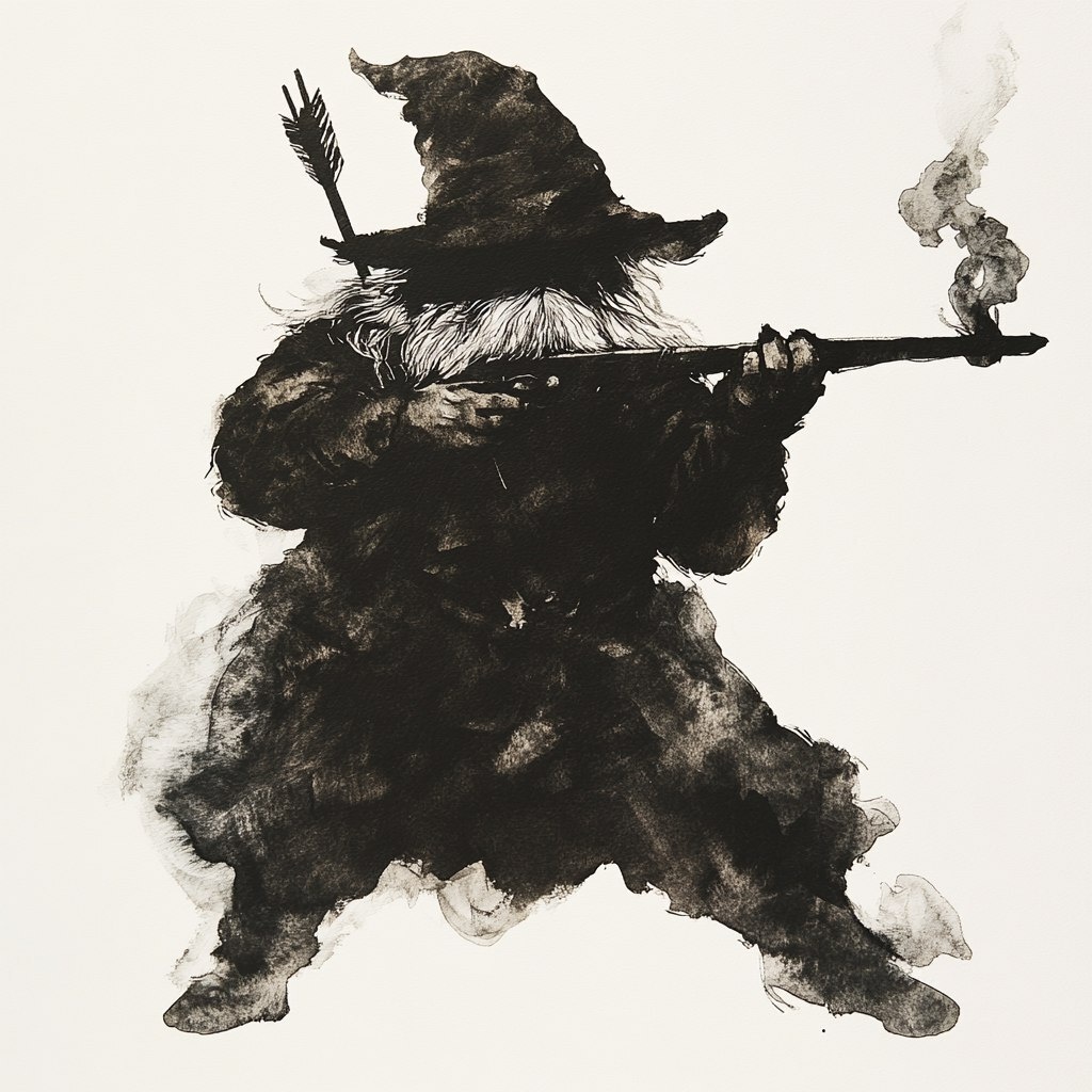 Создано на основе запроса: Shadowy outline of a dwarf witch with crossbow, glowing pipe embers, monochrome watercolor wash, white