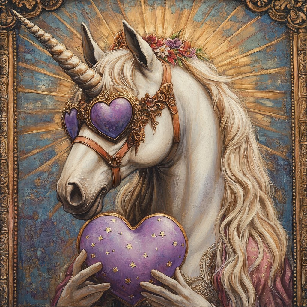 Создано на основе запроса: a gorgeous unicorn horse queen witch is painted on a fresco in the style of our lady of Guadalupe, the unicorn wears heart shaped spectacles and has a strawberry blonde mane, the unicorn saint cradles a large purple heart like a baby --- Автоперевод: Великолепная ведьма королевы единорогов на фреске в стиле Богородицы Гуадалупе, единорог носит очки в форме сердца и имеет гриву из клубники -блондинки, у святого, у него есть большое фиолетовое сердце, как у ребенка Интересно выглядит? 🤔 https://dzen.ru/id/65c0c65c86e4f837c27b24d7 #ИИ #AI #нейросеть #midjourney #art