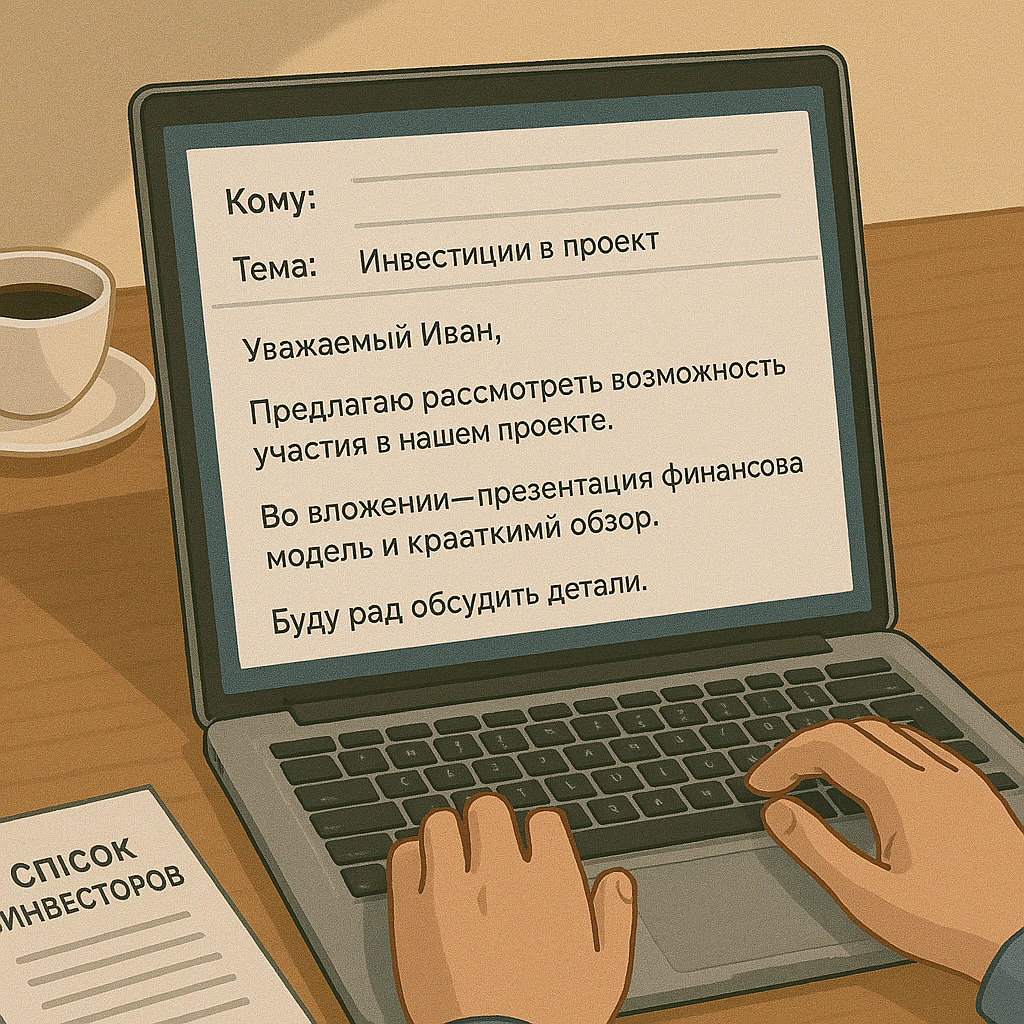 Первое письмо инвестору — это момент истины. У вас один шанс, чтобы зацепить внимание, вызвать интерес и получить «давайте обсудим». На этом этапе инвестор ещё ничего о вас не знает. Ни вашего проекта, ни продукта, ни команды. Только письмо. И именно оно решит, будет ли встреча или ваш email уйдёт в корзину. Это классический формат: короткое, вежливое, с конкретным предложением и кратким описанием. Здесь важно: быть вежливым, не писать «в лоб», адаптировать стиль под платформу. Цель — заинтересовать и перевести диалог в email или Zoom. После установления контакта можно отправить презентацию, one-pager или финансовую модель. Но не в первом письме. Вот проверенная структура, которую используют сотни успешных стартапов: Примеры: Тема должна интриговать и давать конкретику. Здравствуйте, [Имя], Меня зовут Алексей, я сооснователь стартапа «Маркет AI» в области автоматизации e-commerce. Мы ищем партнёра-инвестора для масштабирования и готовы предложить 10% за $100k. Наш сервис автоматизирует