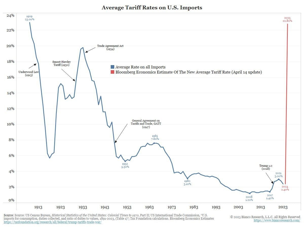 Средняя ставка тарифов с учётом всех новых вводных теперь 22.8% против 2.4% год назад