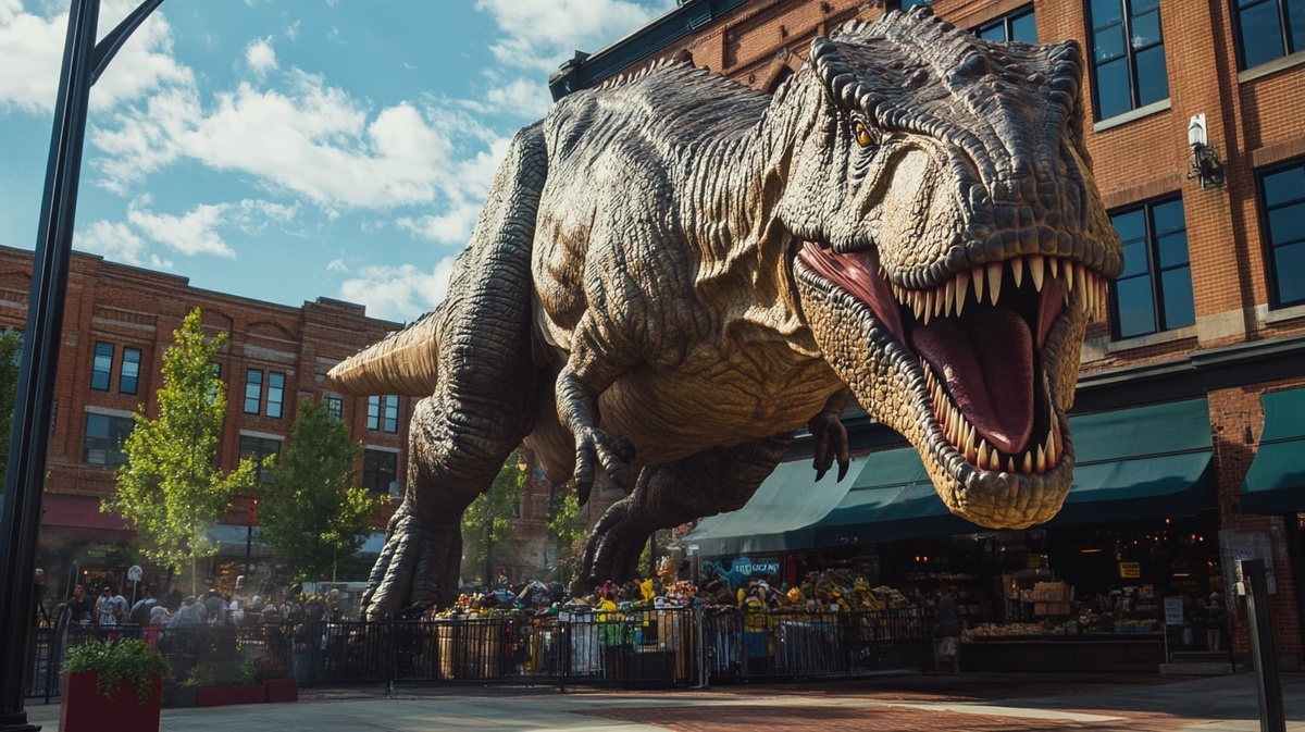 Создано на основе запроса: create an ultra realistic image of a giant t-rex smashing into the Milwaukee Public Market in Milwaukee Wiscosins