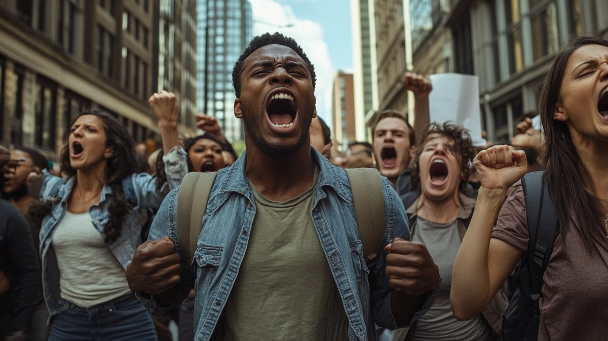Создано на основе запроса: create a very realistic image of people who are black, caucasian and tan screaming in downtown milwaukee