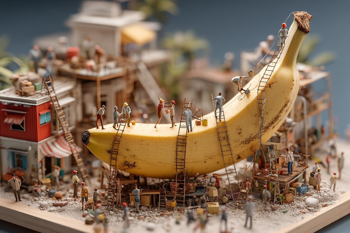 Создано на основе запроса: A realistic, shallow-depth photo of a giant banana lying on the ground in the middle of a small village on a desert island. Dozens of miniature people surround it, looking surprised and curious. Some climb the banana using ropes and ladders, others build scaffolding around it. A few tiny scientists examine it with magnifying glasses. The scene is vibrant, with lots of activity and movement, like a cross between a scientific discovery in a village from a century ago in a storybook. Cinematic lighting, ultra-detail, cinematography, wide-angle perspective, Banana for Scales --- Автоперевод: Реалистичная, неглубокая глубокая фотография гигантского банана, лежащего на земле посреди небольшой деревни на пустынном острове. Что скажешь? 🤔 https://dzen.ru/id/65c0c65c86e4f837c27b24d7 #ИИ #AI #нейросеть #midjourney #art