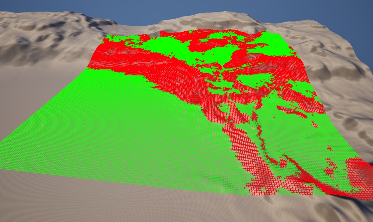 Раньше при строительстве зданий у меня проходило несколько трассировок, одна по углу наклона ландшафта, другая проверяла столкновения с объектами. Сейчас решил сделать сетку, которая будет формироваться в начале игры и один раз проводить трассировку. То есть на красных квадратах даже не будет проверять наличие столкновений.
