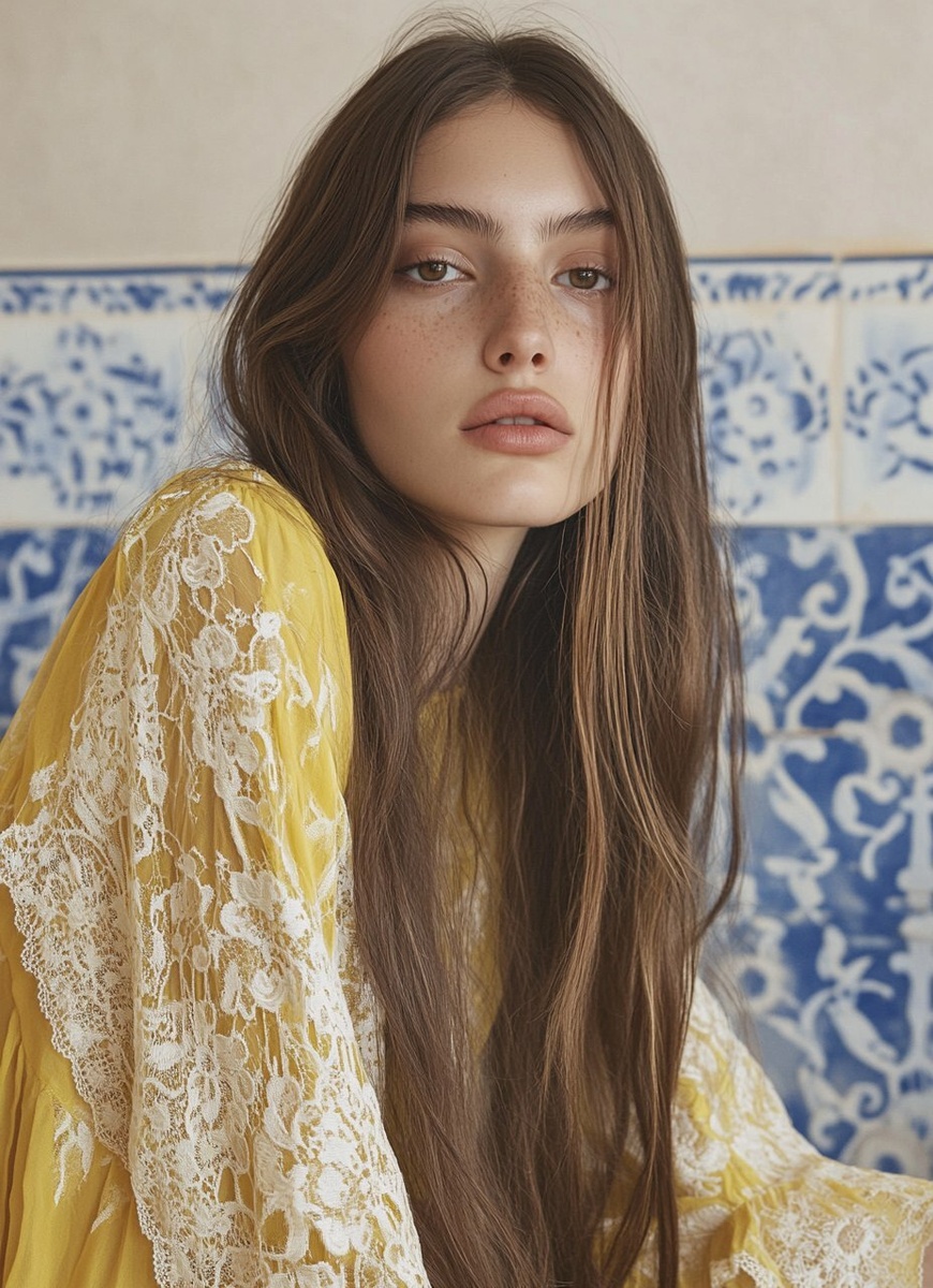 Создано на основе запроса: A photo of the model sitting on top of blue and white tiles, wearing an embroidered yellow blouse with lace details in the style of Jacquemus. She had long, straight brown hair in a half-up style. The background is a light gray color. The image is in a front view. --- Автоперевод: Фотография модели, сидящей на вершине синей и белой плитки, одетый в вышитую желтую блузку с кружевными деталями в стиле Жакема. Классно получилось? 🤔 https://dzen.ru/id/65c0c65c86e4f837c27b24d7 #ИИ #AI #нейросеть #midjourney #art