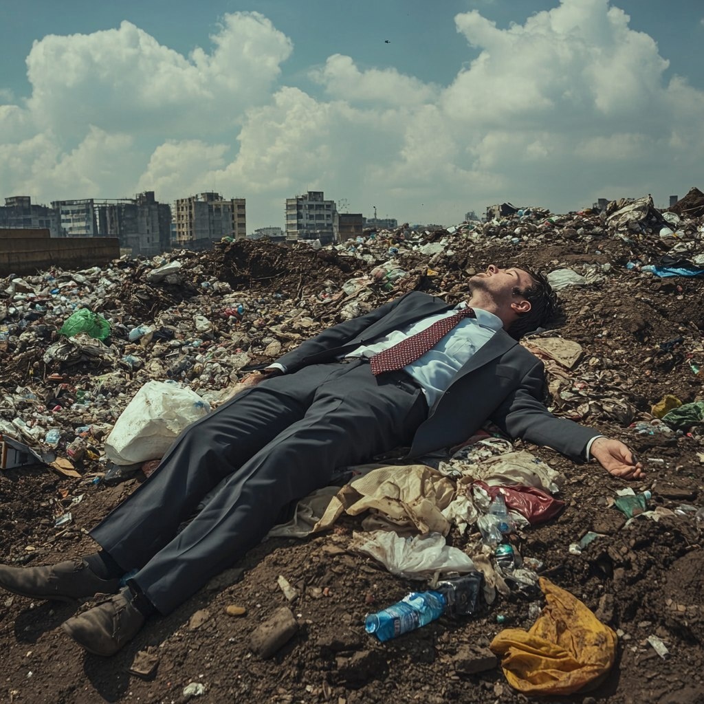 Создано на основе запроса: a white man in a suit and tie dead in a landfill in India