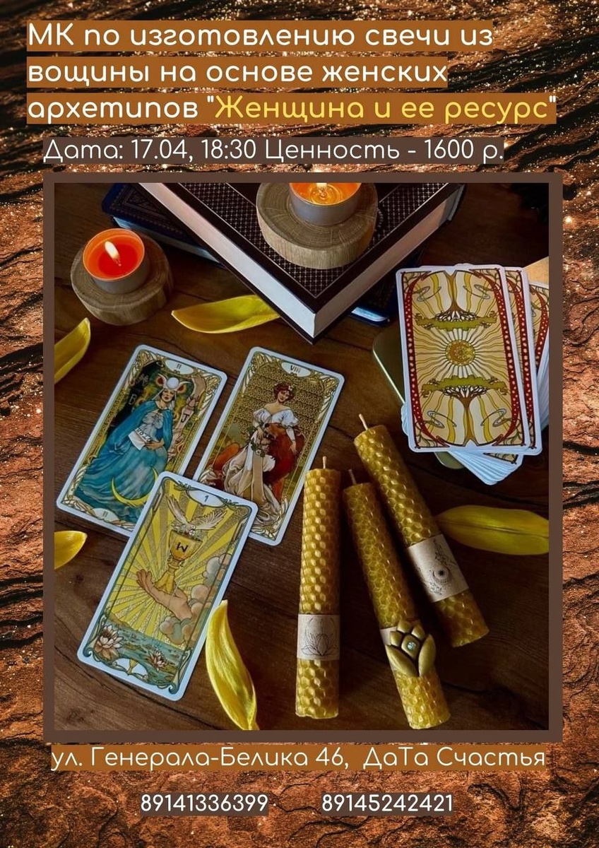 Мастер-класс по изготовлению свечи Вы своими руками изготовите свечу из настоящей вощины с использованием различных ароматных трав и специй, вложив в нее свои желания, привлекая тот ресурс, которого вам не хватает. Дополнением к мастер-классу станет работа с метафорическими ассоциативными картами на тему «Женские архетипы». 🕐17 апреля, 18:30 📍Генерала Белика, 46 🪙1600 рублей 🔑запись по телефону: +79145242421 #Афиша Предложить публикацию @zabkulisye_bot