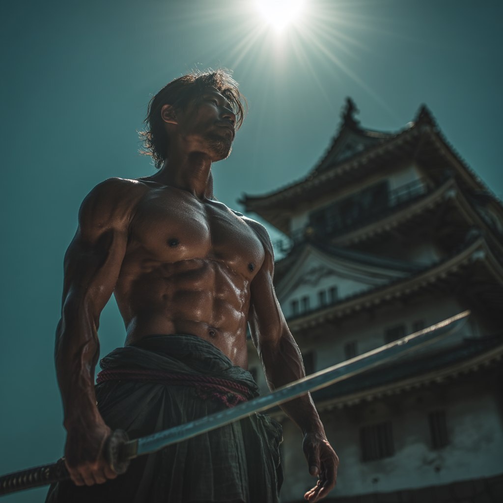 Создано на основе запроса: Samurai, handsome, muscular, Edo period Japanese landscape and castle, holding a sword, the blinding light of the