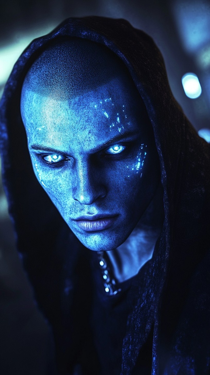 Создано на основе запроса: cinematic portrait of a male orion-type alien warrior, deep-set obsidian eyes, buzz cut, glowing indigo-blue skin with subtle cybernetic textures, intense expression, wearing a distressed black hoodie, silver ring, urban dystopian background, glitch visual effects, dramatic lighting --- Автоперевод: Кинематографический портрет мужского инопланетного воина типа Ориона, глубоких обсидианских глаз, кара Какое твое мнение? 🤔 https://dzen.ru/id/65c0c65c86e4f837c27b24d7 #ИИ #AI #нейросеть #midjourney #art