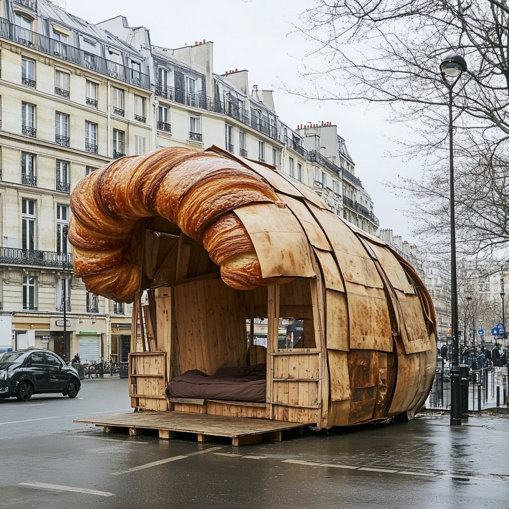 Создано на основе запроса: A temporary shelter in Paris, built with baguettes as the structure, huge croissant as a roof