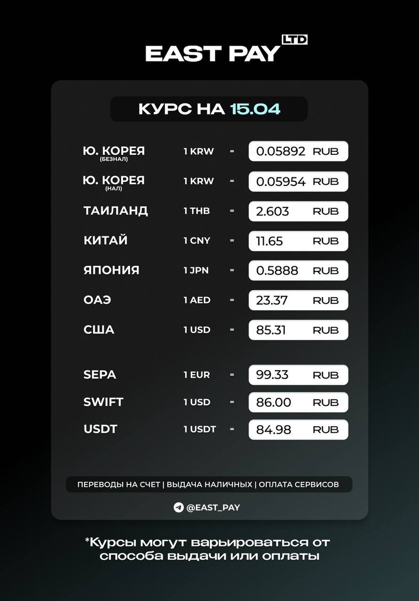💙SWIFT / SEPA переводы 💙Пополнение зарубежных счетов 💙Выдача наличных за границей 💙Криптовалюты 🔘В течение дня курс может меняться. Рекомендуем уточнять актуальный курс у менеджера. ❗️У нас открылся новый офис в Москве по адресу: Пресненская набережная, 12, Башня Федерации (восточный вход) 🔴🔴🔴🔴🔴🔴🔴🔴🔴🔴 🟠Написать менеджеру: @east_pay_world 🟠Сделать просчет самостоятельно в боте: @East_PaySer_bot ✈️ Подписаться на «East Pay»