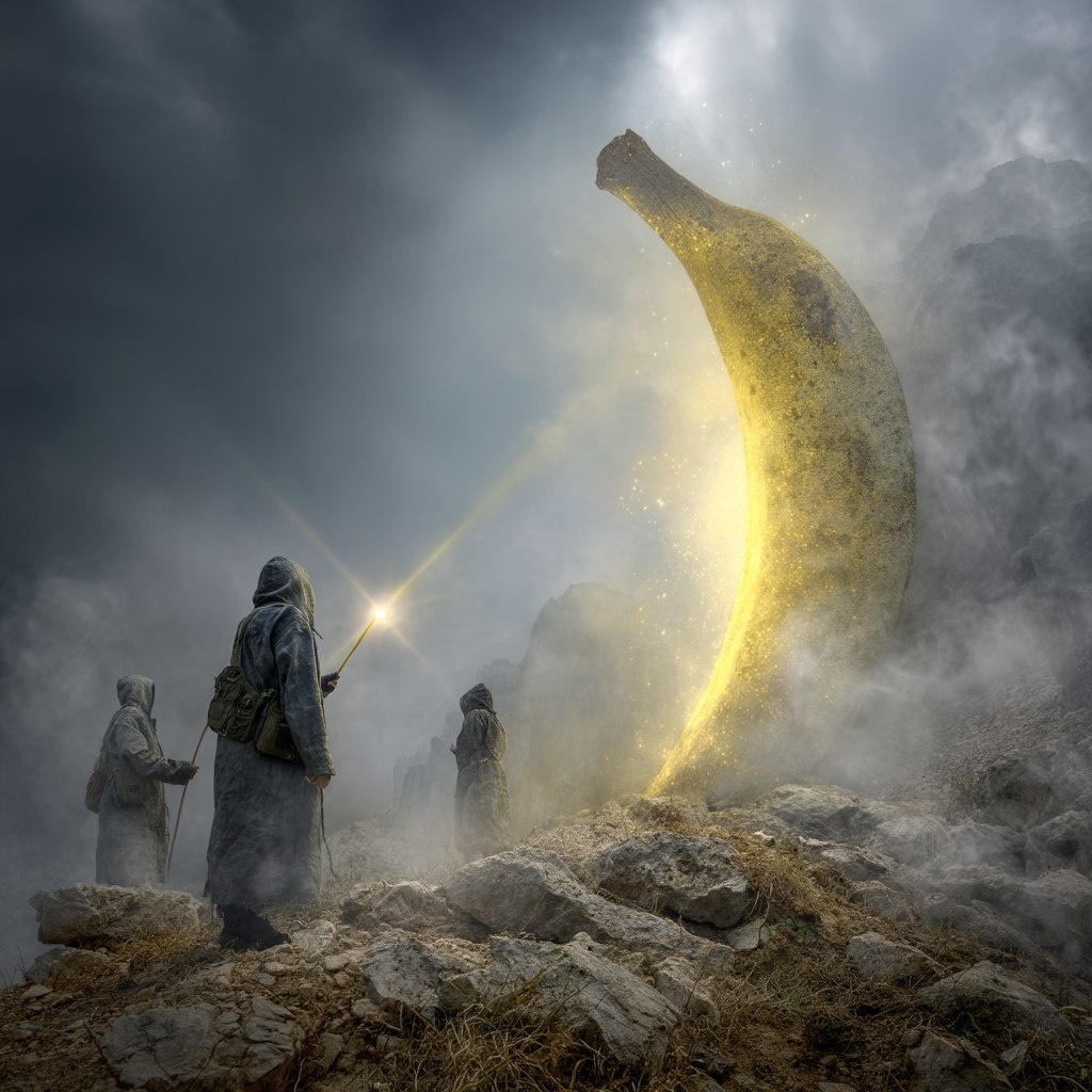 Создано на основе запроса: A surreal mountaintop ritual where hooded figures chant around a glowing, levitating banana suspended in a beam
