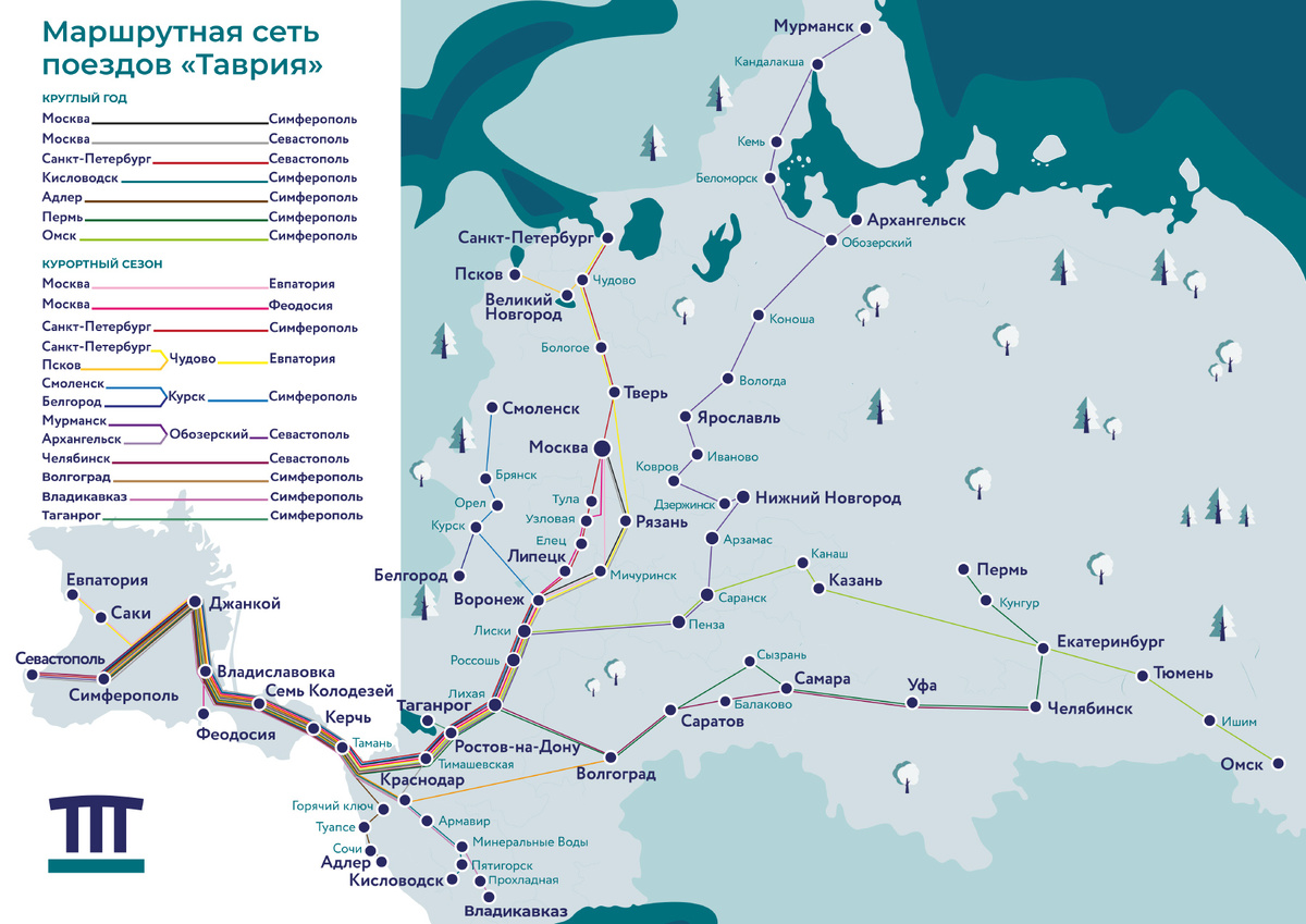 Крымский перевозчик «Гранд Сервис Экспресс» (ГСЭ) опубликовал обновлённую карту маршрутной сети поездов «Таврия» в Крым на лето 2025 года. В этом сезоне туристов, желающих отдохнуть на крымском побережье, ожидает 21 поезд дальнего следования и три группы беспересадочных вагонов, соединяющие полуостров с разными уголками России. Самая насыщенная маршрутная сеть традиционно — у столицы. Из Москвы в Крым этим летом будут ходить восемь поездов. Пять из них — ежедневные, включая фирменный двухэтажный поезд №27/28 «Таврия Экспресс», курсирующий ежедневно до Симферополя. Как и раньше, этот поезд преодолевает расстояние в 2000 километров примерно за 27-28 часов и отличается повышенным уровнем сервиса. По крайней мере, так говорит сам перевозчик. Новинкой сезона станет поезд №168/167, тоже двухэтажный, который будет курсировать раз в четыре дня и чередоваться с уже существующим поездом №68/67. Поезда из Москвы следуют в Симферополь, Севастополь, Евпаторию и Феодосию, охватывая все основные куро