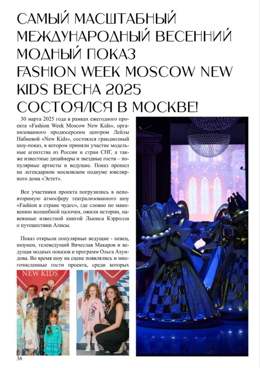 Самый масштабный международный весенний модный показ Fashion Week Moscow New Kids Весна 2025 состоялся в Москве! 30 марта 2025 года в рамках ежегодного проекта «Fashion Week Moscow New Kids», организованного продюсерским центром Лейлы Набиевой «New Kids», состоялся грандиозный шоу-показ, в котором приняли участие модельные агентства из России и стран СНГ, а также известные дизайнеры и звездные гости – популярные артисты и ведущие. Показ прошел на легендарном московском подиуме ювелирного дома «Эстет». Все участники проекта погрузились в неповторимую атмосферу театрализованного шоу «Fashion в стране чудес», где словно по мановению волшебной палочки, ожили истории, навеянные известной книгой Льюиса Кэрролла о путешествии Алисы. Показ открыли популярные ведущие - певец, шоумен, телеведущий Вячеслав Макаров и ведущая модных показов и программ Ольга Ахундова. Во время шоу на сцене появлялись и многочисленные гости проекта, среди которых популярные артисты, блогеры и селебрити Оксана