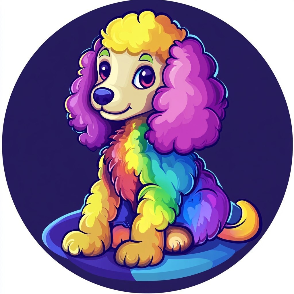Создано на основе запроса: cute chibi of a very colorful dog poodle with a long snout, for a logo, cartoon style high quality clean circle
