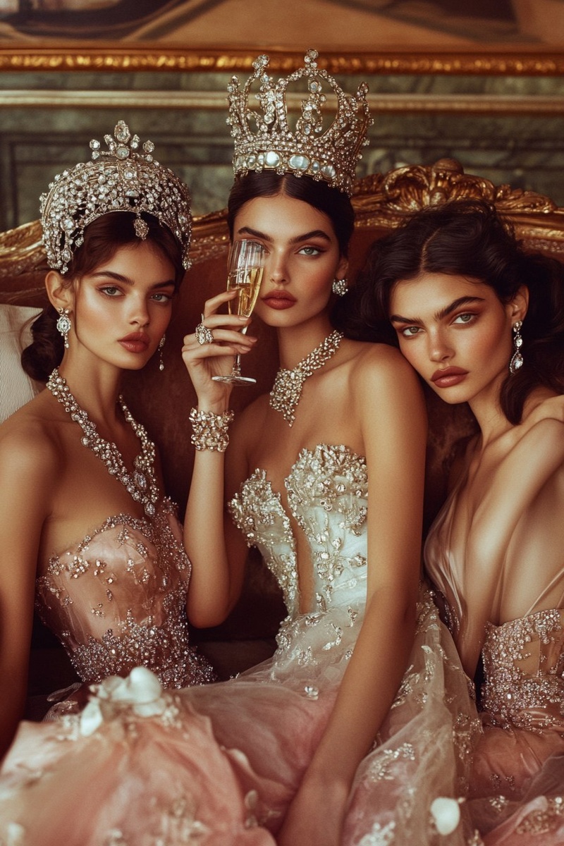 Создано на основе запроса: vogue magazine cover photo of 3 realistic models all wearing chanel and lots of jewellery, they are sitting on a