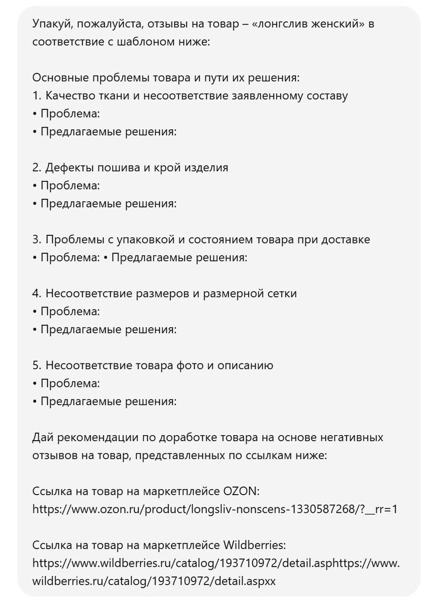Как отзывы помогают делать хиты на маркетплейсах? Когда речь заходит о выборе ниши или запуске товара на Wildberries или Ozon, у большинства новичков возникает один и тот же вопрос: «А как понять, что действительно нужно покупателям?» Ответ проще, чем кажется: читайте отзывы. Но не просто читайте - анализируйте их по определённой системе. Недавно мы протестировали этот подход на примере женского лонгслива. Вот что мы сделали: 1: Собрали отзывы с маркетплейсов (OZON и WB) Мы взяли популярную модель лонгслива и системно изучили, что именно нравится и не нравится покупателям c помощью искусственного интеллекта. А конкретно - использовали СhatGPT (так как другие ИИ не все способны собрать данные с представленных ссылок). 2: Выделили повторы - "паттерны боли" Вот реальные замечания: «ткань слишком тонкая и просвечивает» «размер маломерит - берите на размер больше» «после стирки быстро теряет форму» «не соответствует составу ткани, указанному в карточке» Ранее приходилось собирать и а