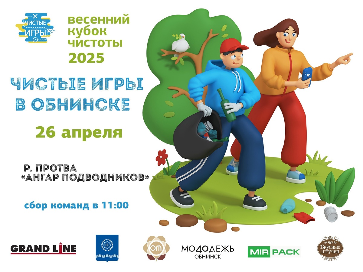 Чистые игры на берегу реки Протвы! 26 апреля в Обнинске пройдут командные соревнования по очистке природных территорий от мусора «Чистые игры»! Принять участие может любой желающий! Соберите команду от 2 до 4 человек и зарегистрируйтесь по ссылке: https://cleangames.org/game/obninsk_2025_1 В этом году участникам предстоит убрать берег реки Протвы. Сбор команд в 11:00 около ангара подводников. Старт соревнований в 12:00. Одевайтесь по погоде, берите с собой резиновые сапоги, небольшой рюкзак для игрового реквизита, заряженный смартфон и хорошее настроение. Не забудьте обработать одежду препаратами от клещей. Экологические соревнования Чистые игры объединены в «Евразийский Кубок Чистоты», проводятся по всей России и в странах СНГ. Больше информации в сообществе ВКонтакте. Встречаемся на Чистых играх 26 апреля! #ЧистыеИгрыОбнинск #житьЭКОлогично
