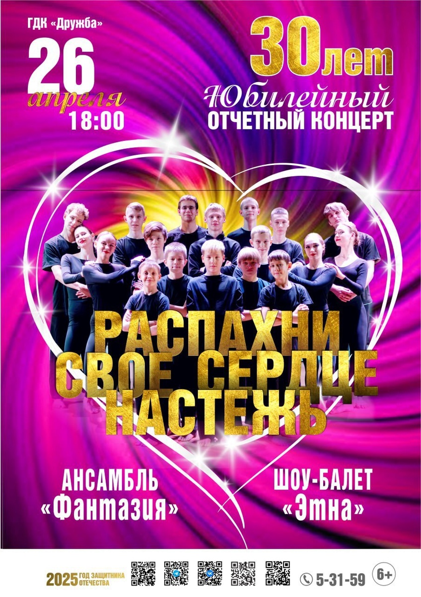 Мы больше не будем рекламировать юбилейный отчетный концерт "Распахни свое сердце настежь" шоу-балета "Этна" и хореографического ансамбля "Фантазия"😉 Потому что билетов осталось мало. Но еще 14 счастливчиков смогут попасть на концерт😀 Мы не говорим "торопитесь", мы говорим "🏃🏃🏃!" 🗓️ 26 апреля 🕕 18.00 💳 Билеты доступны по Пушкинской карте. Касса: 5-31-59. Приобрести билеты можно также на сайте ДК “Дружба”: https://clck.ru/337GuN