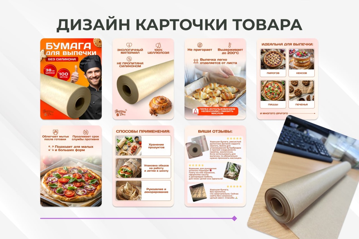 Даже с фото с телефона можно сделать продающий вариант, но: ✨Простые товары (одежда, техника) – реально обработать идеально. ✨Сложные объекты (волосы, стекло) – потребуют ручной работы. ✨Всегда предупреждать клиента о возможных ограничениях! Главное: не бояться брать такие заказы, и адекватно оценивать время/сложность. 💪 Дизайн слайдов для магазина товаров для запекания и приготовления пищи 👌Все фото сгенерированы в нейросети @designer_taya