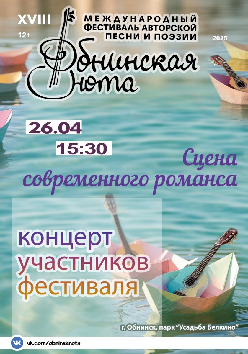 🎶26 апреля с 15:00 до 17:00 в парке «Усадьба Белкино» в Обнинске пройдёт концерт участников фестиваля авторской песни и поэзии «Обнинская нота». Вход свободный. 👍 Подписаться | Прислать мероприятие
