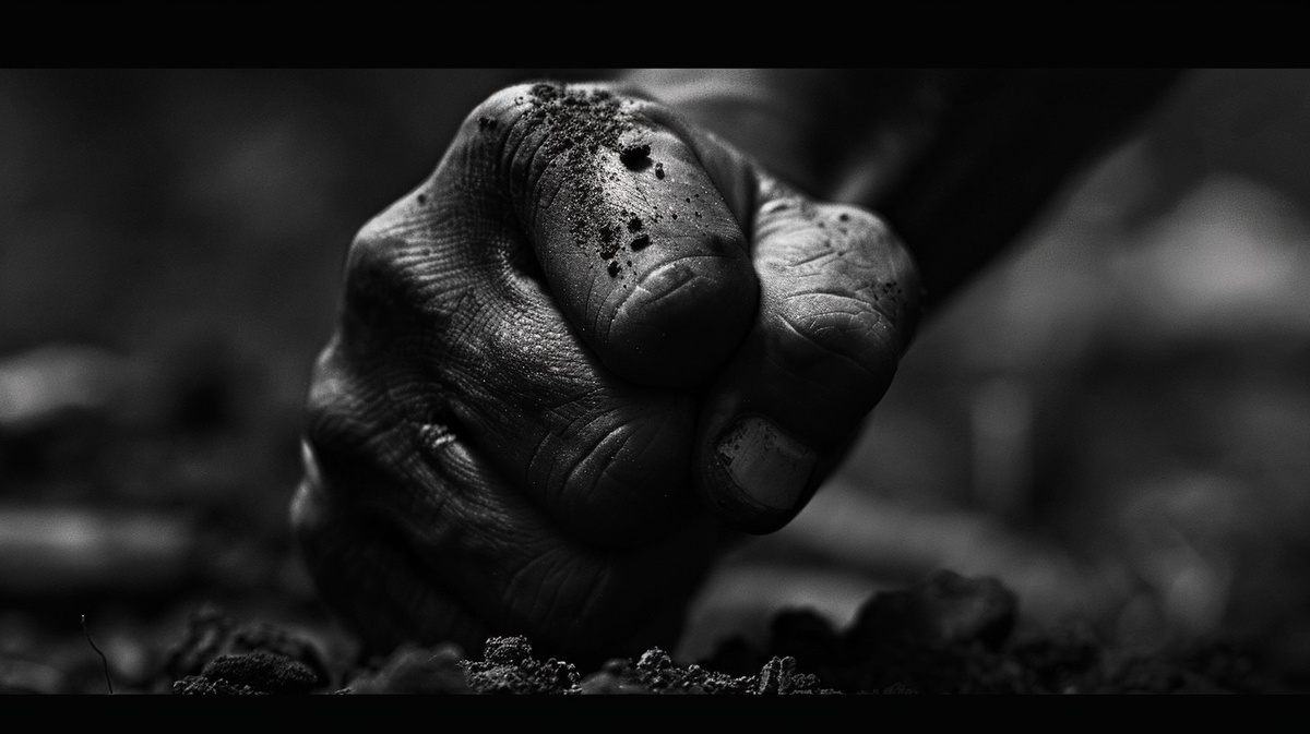 Создано на основе запроса: macro view of a tight fist, with knuckles in the ground. Biblical times. Realistic photo style, black and white, dramatic lighting, shallow depth of field, emotional, cinematic shadows, moonlight filtering through trees, RED Komodo 6K realism --- Автоперевод: Макро видит плотный кулак, с суставами в земле. Классно выглядит? 🤔 https://dzen.ru/id/65c0c65c86e4f837c27b24d7 #ИИ #AI #нейросеть #midjourney #art