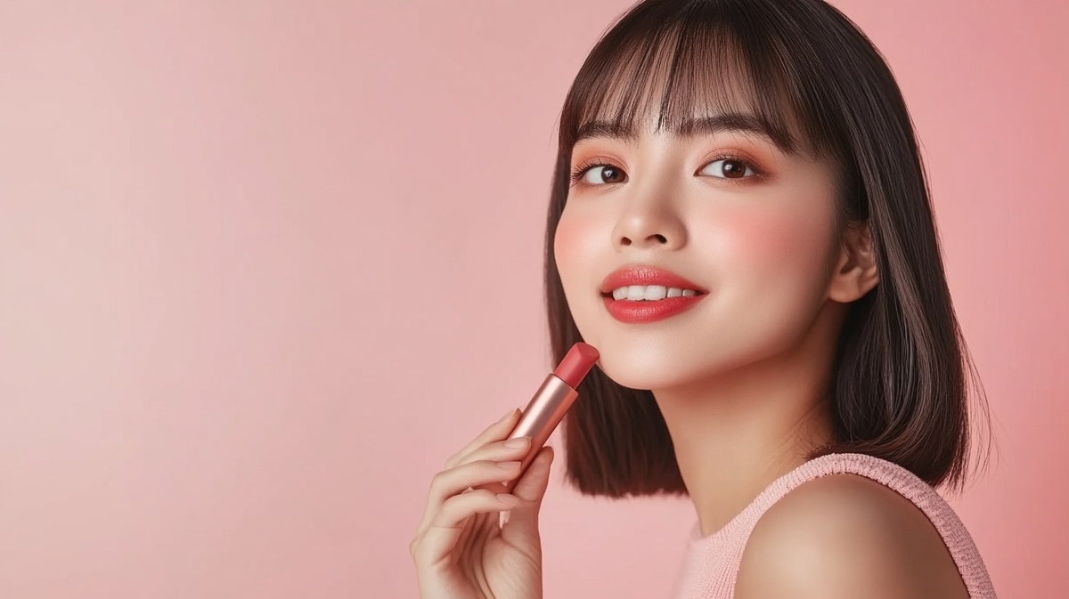 Создано на основе запроса: a beautiful young asian woman with soft bangs and straight dark brown hair, natural makeup, holding a lipstick