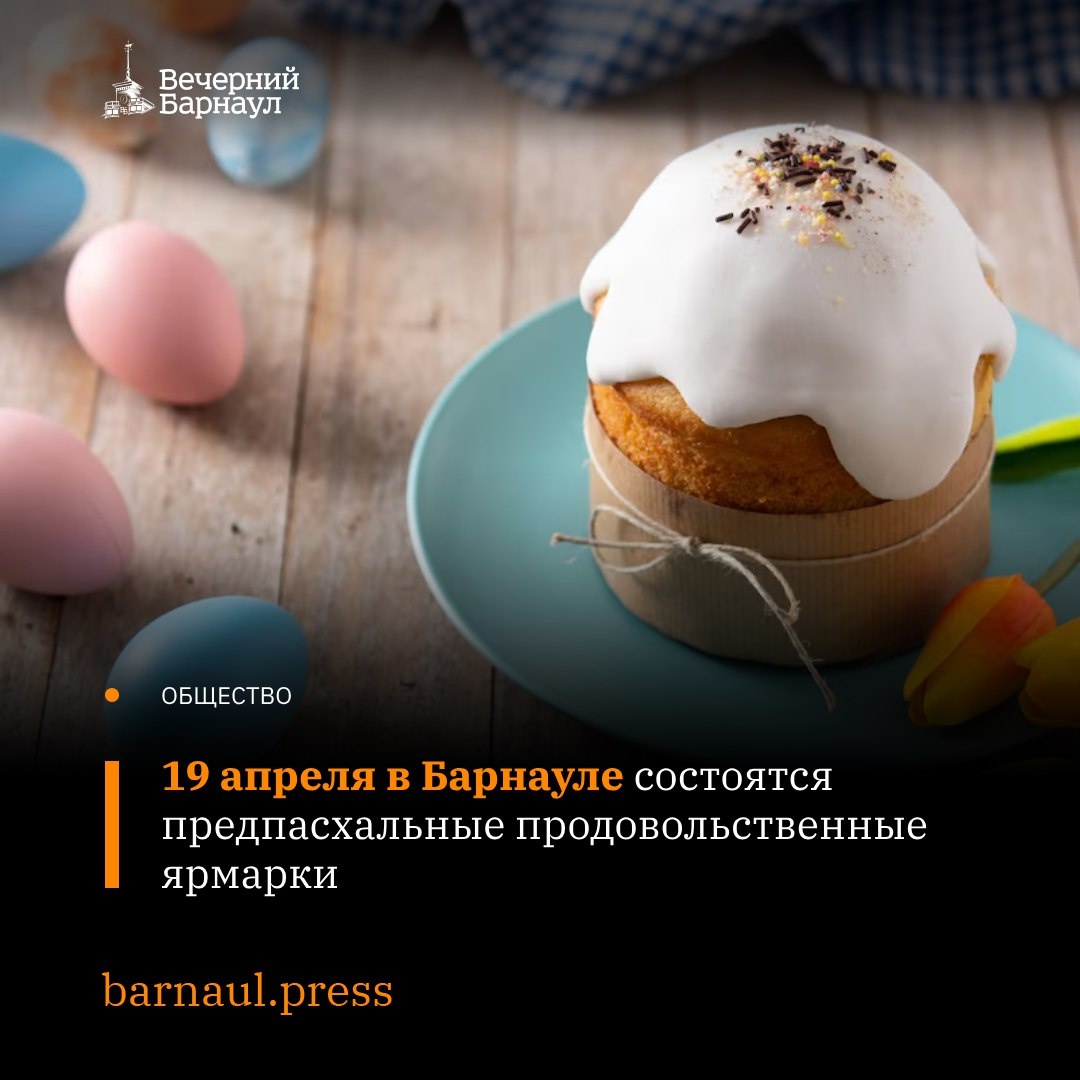 В преддверии Пасхи, 19 апреля, в Барнауле состоятся продовольственные ярмарки выходного дня. Там можно будет приобрести разнообразные продукты: мясо птицы, свинину и говядину, колбасные изделия, мясные деликатесы, яйца, рыбу, фрукты, овощи и многое другое. Пекарни и кондитерские предложат покупателям широкий выбор куличей. Ярмарочные площадки будут работать с 10:00 до 14:00 по следующим адресам: 🔸Железнодорожный район — проспект Ленина, 71 (площадка у ТЦ «Россия»); 🔸Индустриальный район — улица Энтузиастов, 12в (Парк спорта Алексея Смертина); 🔸Ленинский район — площадь Народная; 🔸Октябрьский район — улица Германа Титова, 9 (сквер имени Германа Титова); 🔸Центральный район — проспект Красноармейский, 36; улица Чайковского, 21а. Фото: @chandlervid85 / freepik.com @barnaul