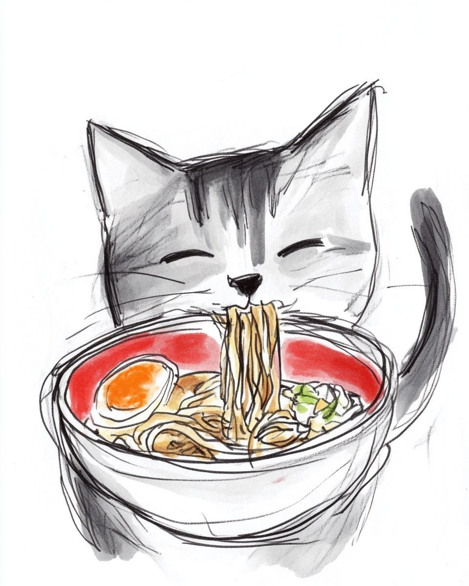 Создано на основе запроса: graphic illustration of cat eating bowl of ramen
