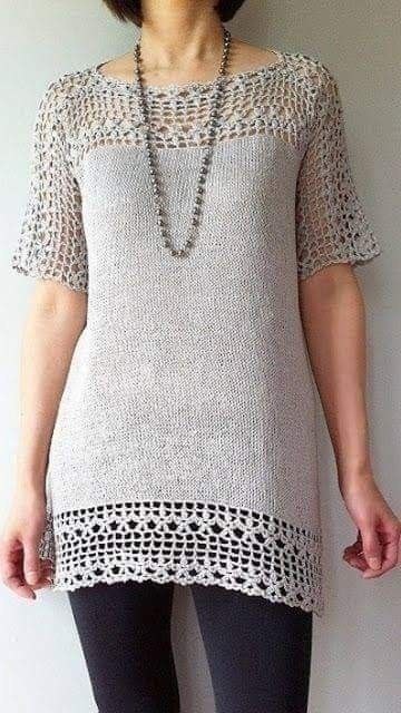 Туника, связанная сочетанием плотного узора и ажура.Основное полотно связано скорее всего, лицевой гладью спицами или машинным вязанием). Ажурная кокетка, переходящая в рукава, связана крючком.