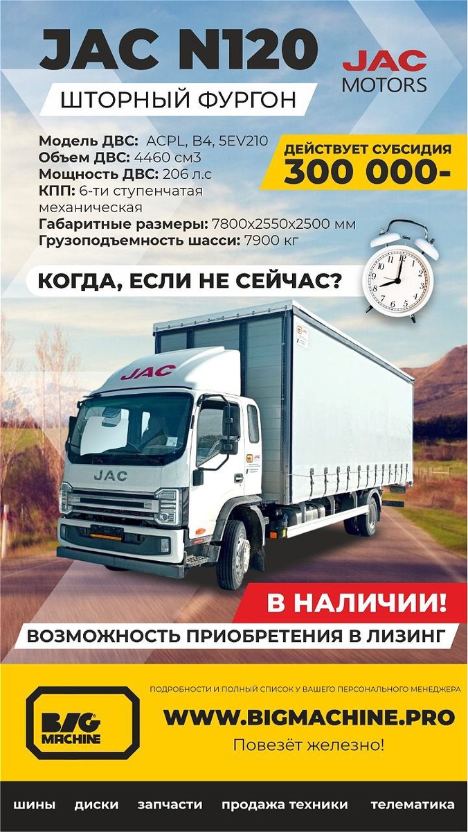 В наличии шторный фургон JAC N120! 🔥 Объём ДВС: 4460 см3 Мощность ДВС: 206 л.с. Г/п шасси: 7900 кг 👉🏼 Возможно приобретение в лизинг Подробности по телефону: 📞 88007001509