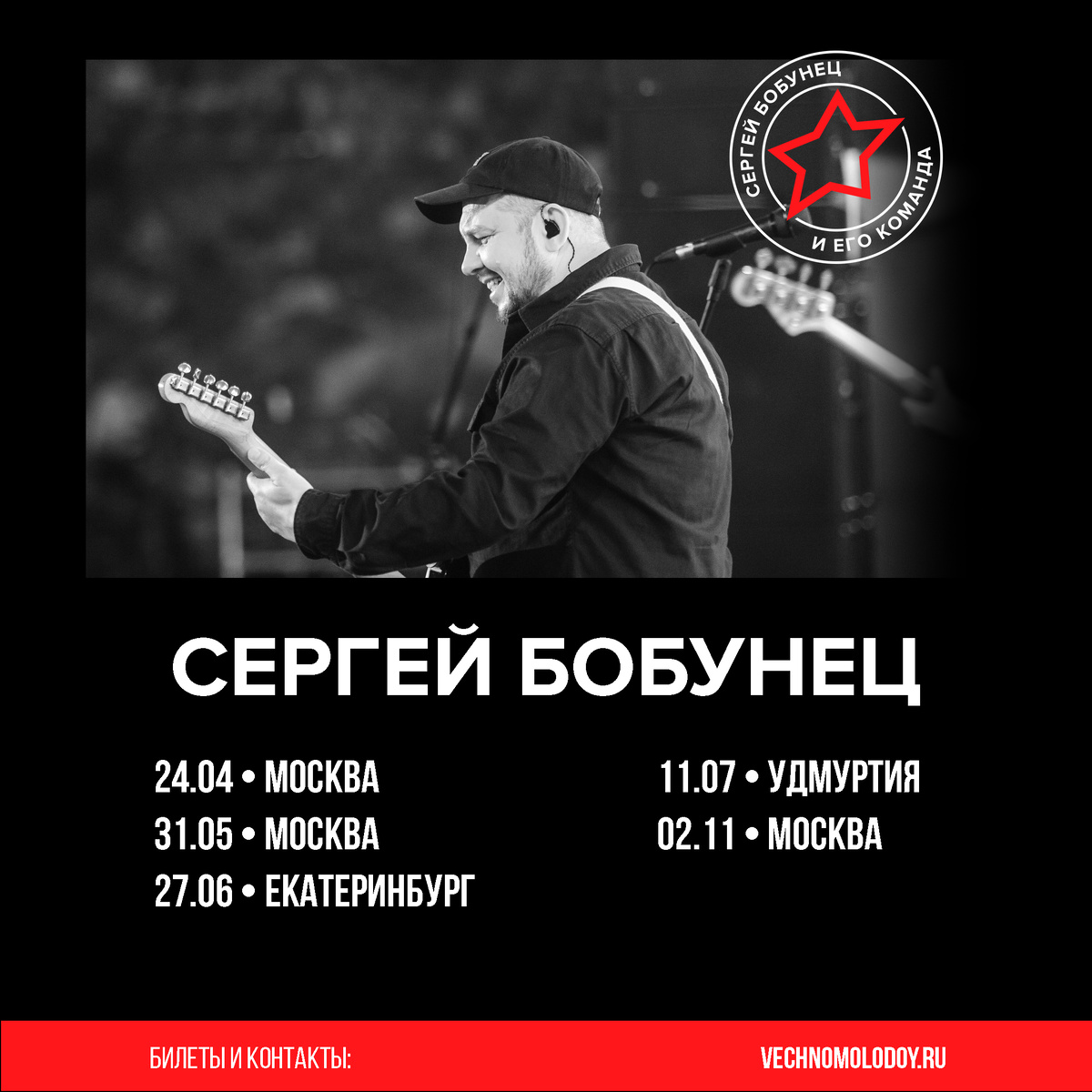 24.04 • Москва, «Live Arena», шоу «Золотые хиты МУЗ-ТВ». Билеты: vk.cc/cHl6Hp 31.05 • Москва, «LAB с Антоном Беляевым». Билеты: vk.cc/cCZpSD 27.06 • Екатеринбург, фестиваль «Ural Music Night». Вход свободный. 11.07 • Удмуртия, фестиваль «Улетай». Билеты: vk.cc/cEO1Zo 02.11 • Москва, клуб «1930 Moscow», с симфоническим оркестром. Билеты: vk.cc/cKmfwL Билеты и контакты: vechnomolodoy.ru