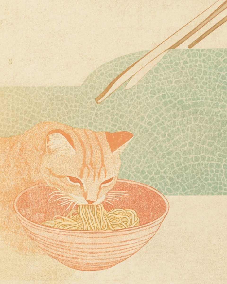 Создано на основе запроса: graphic design of cat eating bowl of ramen